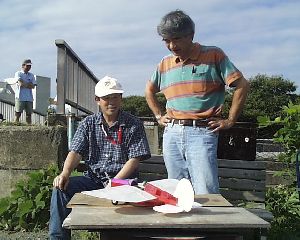 白地にパープルのカラーが 美しい機体です。 オーナーは大西さんです。 「さあ、いくぞ〜!!」フライト前の入念なチェック。 当日は風向きがちょっと不安定で、発進と着陸は皆さん苦労されてました。 この機体はVテールで実にスマートな機体です。 空気抵抗が少ないようで、とても良く滑空していました!!