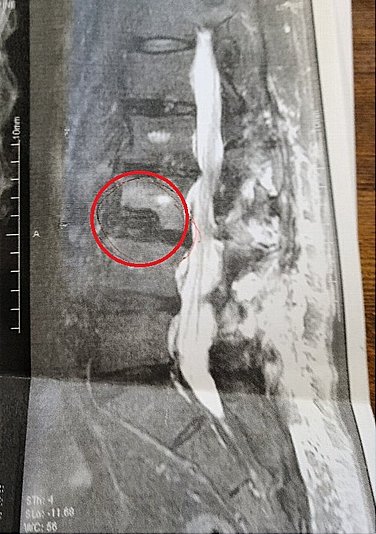 腰椎骨折(MRI画像)右の白い神経は狭くなっておらず血行も良い